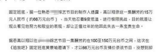 据台湾媒体报道,高以翔的追悼会由金宝轩殡仪馆承办,整个仪式耗资约17万元。然而,高以翔以15万元参与《追我》,让很多粉丝和网友哀叹不值得去死,并贴出2万元。