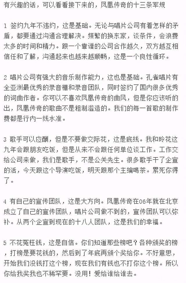 曾毅发了一篇文,依旧不卑不亢地列了凤凰传奇的十三条“军规”,陈述他们的坚持。