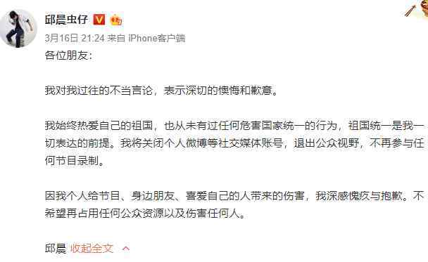 邱晨16日9时许作出回应,称对自己过往的不当言论,表示深切的懊悔和歉意。其表示始终热爱自己的祖国,也从未有过任何危害国家统一的行为,祖国统一是其一切表达的前提。其将关闭个人微博等社交媒体账号,退出公众视野,不再参与任何节目录制。↓