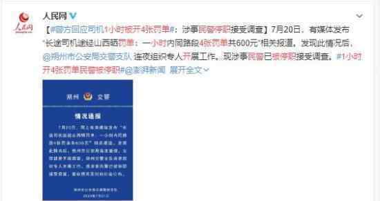 据朔州市公安局交警支队官方微新闻报道,7月20日,相关网络媒体发布了“长途司机途经山西晒票:同一路段4张,一小时600元”的报道。朔州公安局发现这一情况后,高度重视,立即部署开展调查。朔州交警支队组织专人连夜开展工作。涉案民警已被停职调查,调查和处罚将及时向社会公布。