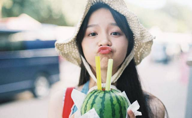 借助手里的道具,比如可乐,比如西瓜,吃着吃着,来一个wink,suddenly 。