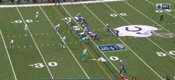 上半场还剩4分钟,小马决定打4档1码,代替四分卫布里塞特,而拉克尔在进攻组最左边。海豚保安菲茨帕特里克放弃了看守拉克,这给了拉克足够的抓捕时间空。