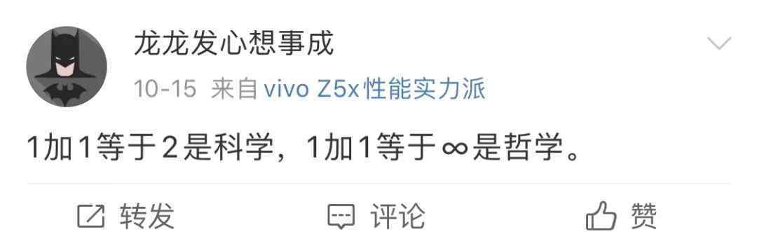 有人说在布尔代数的运算下,1+1 = 1;在二元情况下:1+1=10,在物理同质的条件下,1+1=同类;如果从脑筋急转弯来看,1+1=场;甚至在单狗眼里,1+1就是一出戏,各种答案满天飞,让人哭笑不得!