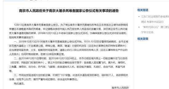 1.2019年12月13日10:00,南京大屠杀遇难同胞全国公祭仪式开始。在10时01分至10时02分警报声响起期间,在城市主城区道路(不含高速公路、环城公路、高架道路、隧道)上行驶的机动车(执行紧急任务的特种车辆除外)应当停止行驶并鸣笛哀悼,火车、轮船同时鸣笛哀悼。道路上的行人和公共场所的所有人都从事特殊工作。