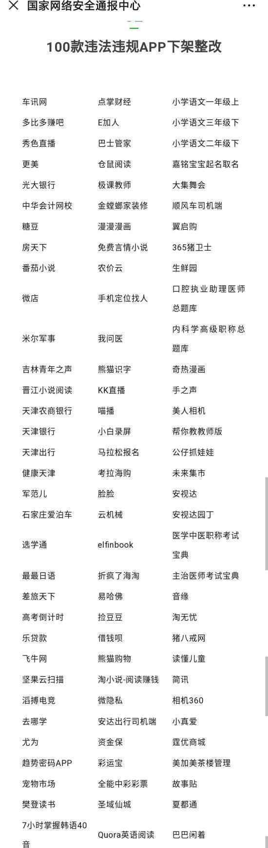12月4日,国家网络与信息安全信息通报中心在官方微信微信官方账号上披露,自2019年11月起,全国各地公安机关网络安全部门集中查处整治100家非法收集和使用个人信息的应用及其互联网企业,有考拉海购、微店、耿梅、天津银行、方天霞等多种知名产品和产品。