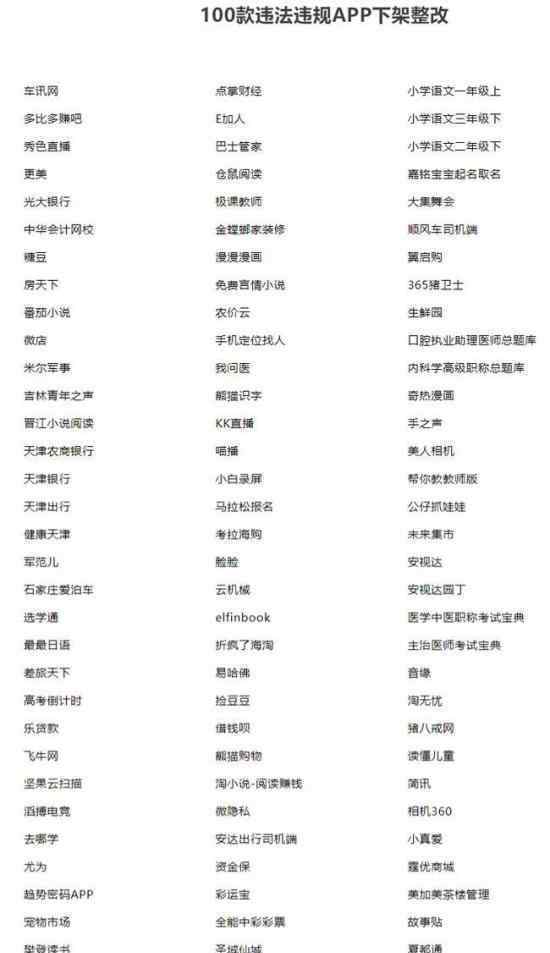 据国家网络安全通报中心通报,11月以来,公安部组织对APP违法违规收集的个人信息进行集中整改,重点是无隐私协议、个人信息收集使用范围描述不清、个人信息超范围收集、个人信息不必要收集等。在其他案件中,发现、调查、查处和整改了100家违法违规的app及其互联网公司,包括光大银行、华美、考拉海宝、微店、晋江小说阅读、飞牛网