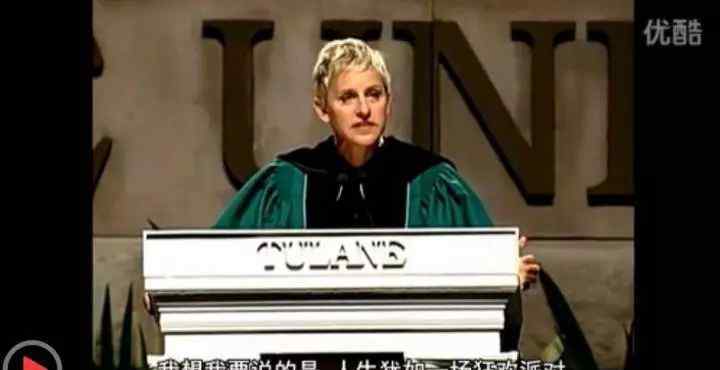 著名脱口秀主持人艾伦以自己的经历鼓励毕业生(高中辍学,19岁女友车祸身亡,出柜三年不工作节目停播等。)和幽默的语言:真实的过好每一天才是真理。