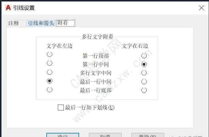 注意:附件是指多行文字的位置,可分为左边或右边。如图,设置左边文本:最后一行中间,右边:第一行中间效果。