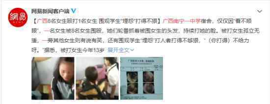 据悉,6月28日,广西小南中学,就因为“不顺眼”,8名女生来到视频中被打女生的宿舍,实施了抓头、打脸等行为。