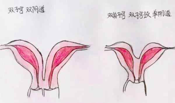 单宫颈管或宫颈管有分离的双子宫:双子宫两侧狭长,对称。经阴道超声可检测双侧子宫外侧的子宫动脉,子宫内膜随月经周期有规律地变化。常有双宫颈、双阴道或阴道完全纵隔。高分辨率阴道彩色多普勒超声能清晰显示两宫颈的回声。必要时,可进行过氧化氢对比增强超声,以显示其各自的子宫腔。