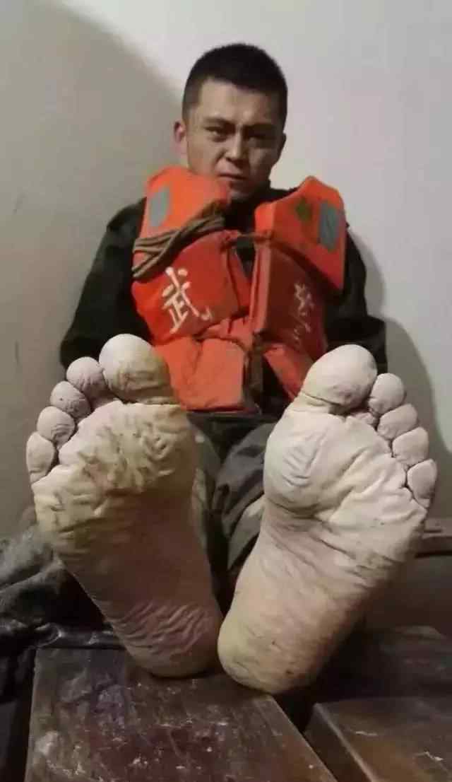 是一双让人心疼又忍不住顶礼膜拜的大脚。照片中,一名年轻的武警战士,眉头微皱,坐在靠墙的长椅上。他还没来得及脱掉一件橙红色的湿救生衣的装甲,在沾满泥巴的迷彩裤下,他那双有着白脚和竖褶的大脚正对着镜头。