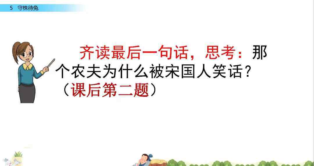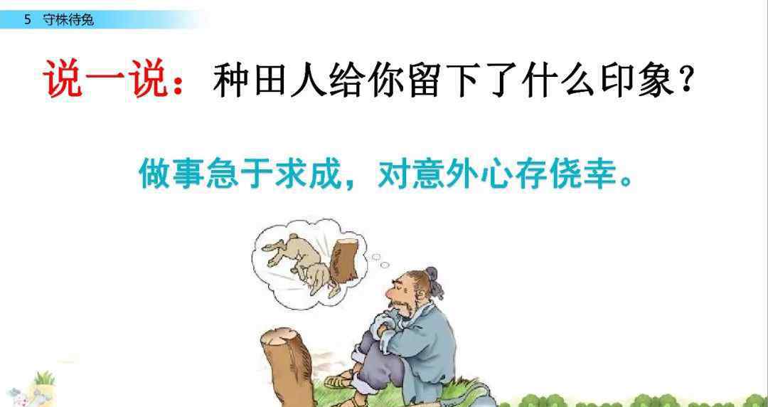 《等兔子》,改编自《万事俱备》中的文章,讲的是古代一个农场工人在树桩上不小心被打死了一只兔子的故事。从那以后,他放下锄头,在树桩旁等了一整天,但再也没有得到一只野兔,土地荒芜了。通过学习,学生应该知道不要把一个偶然的事件视为不断发生的事情,不要为意外的收获而幸运。