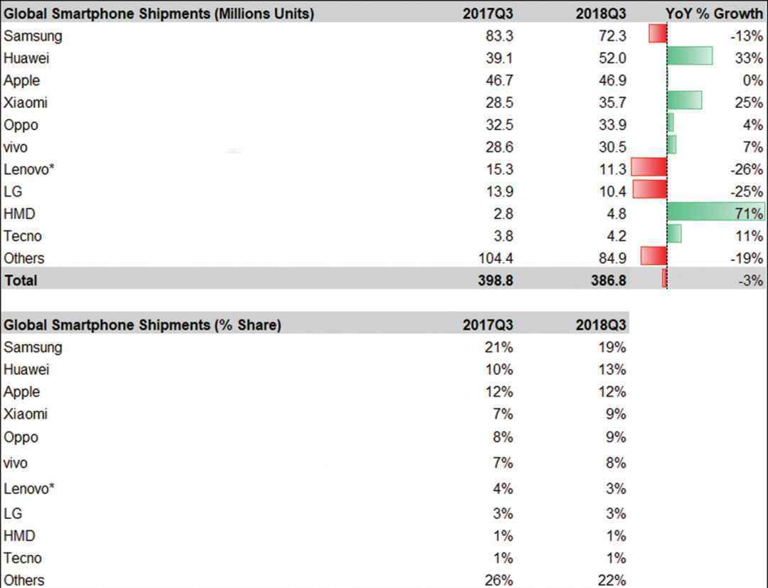 ▲虽然全球智能手机市场疲软,但华为手机出货量和市场份额逆势大幅增长。