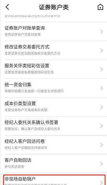 值得注意的是融资融券账户、衍生合约账户等。仍然需要在现场关闭。经纪人可以为异地开户提供便利条件,尽量为老人、残疾人、卧床病人等行动不便的特殊群体提供见证销户等便利措施。