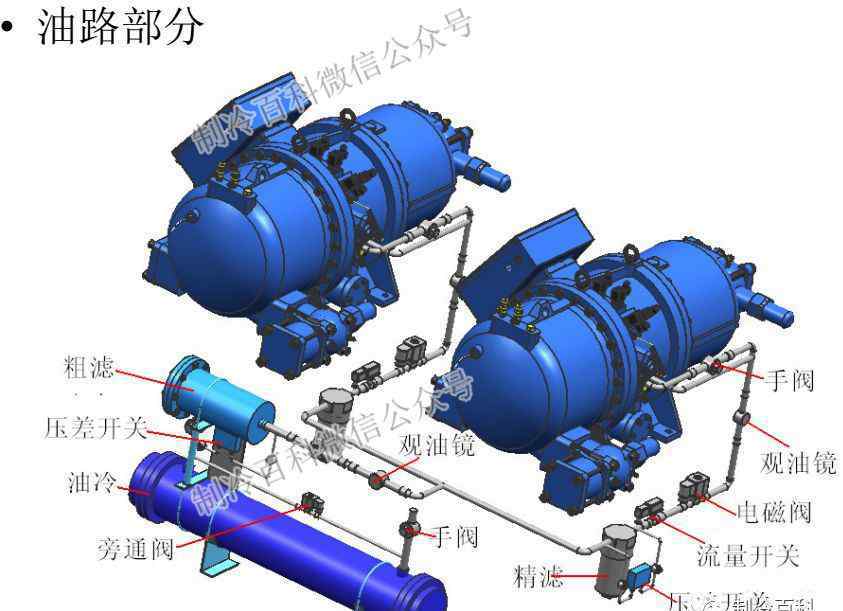 螺杆机组油路流程为:油分离器~油冷却器~油过滤器~油泵~精油过滤器~压缩机~油分离器。