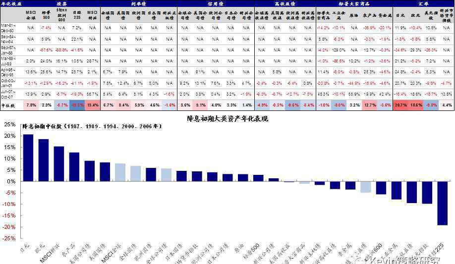 降息之初,股票>:债券>:大宗商品、日元、欧元、农产品领涨,日本股市、美元、欧洲高收益债券、工业金属等表现不佳