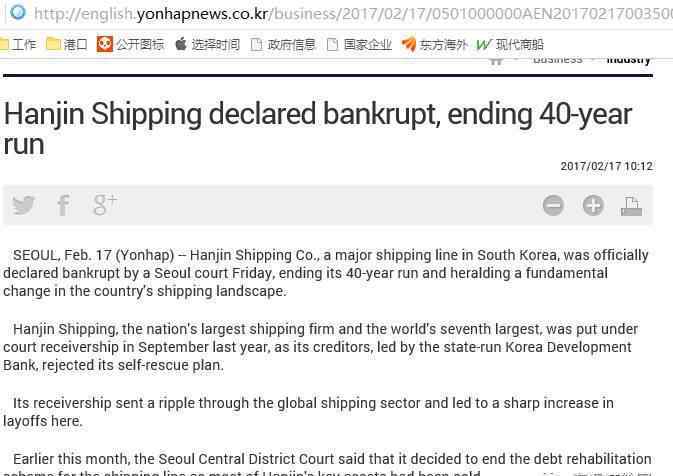 2017年2月17日,首尔中央法院正式宣布,韩进海运大部分资产已被拍卖,并于2月17日正式宣布破产,结束了运营40年的集装箱业务,标志着韩国的航运业务将发生根本性变化。