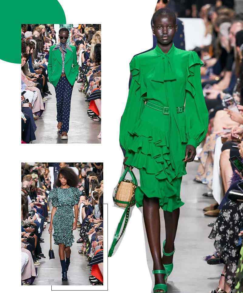 迈克高仕2020春夏系列,配有金属纽扣和众星云集的标志等军装细节,充满海军风格。绿色和红色在这个时候的MK设计中是非常强大的。