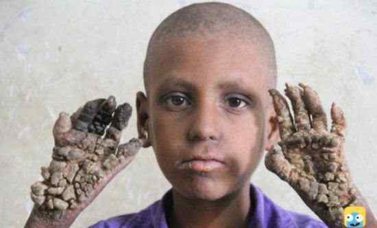 看起来像是人体面板上长出的分枝,其实是疣状表皮发育不良。当然不是树枝长出来的。这些东西都是疣,太阳会让情况变得更糟;这些疣往往发生在生命的开始,以后会变成恶性疾病。这个疣是EVER1/EVER2基因罕见变异造成的。虽然该基因的功能尚不清楚,但其变异将使该小组极易受到5号和8号乳头瘤病毒的感染,这两种病毒通常不容易引起疾病。有些治疗方法可以缓解症状,但是没有办法根除。