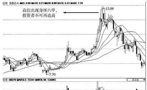 深桑达A这只股票从2010年2月初的7.7元开始强势拉升,到2010年4月中旬时股价已涨至13.09元,上涨幅度接近翻番。股价于4月15日拉出一根大阳线之后,次日便收出一根低开低走的中阴线,全天最高价和最低价都未超出前一天股价运行区域,收出了一对高位的身怀六甲。神商大A的股票从2010年2月初的7.7元开始强势上涨,到2010年4月中旬,其股价已经涨到13.09元,涨幅接近一倍。4月15日股价拉出一条大阳线后,收盘于一条中间阴线,该线低开,次日走低。全天最高价和最低价都没有超过前一天的股价操作区域,一对高级孕妇被关闭。