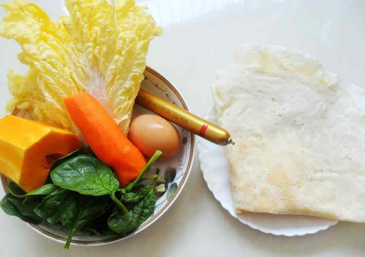 2 白菜、菠菜洗干净切碎,胡萝卜、南瓜洗干净去皮擦成丝,火腿切片。