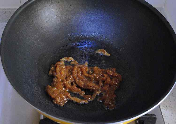 9 五六成热时放入腌制好的里脊肉丝滑炒。
