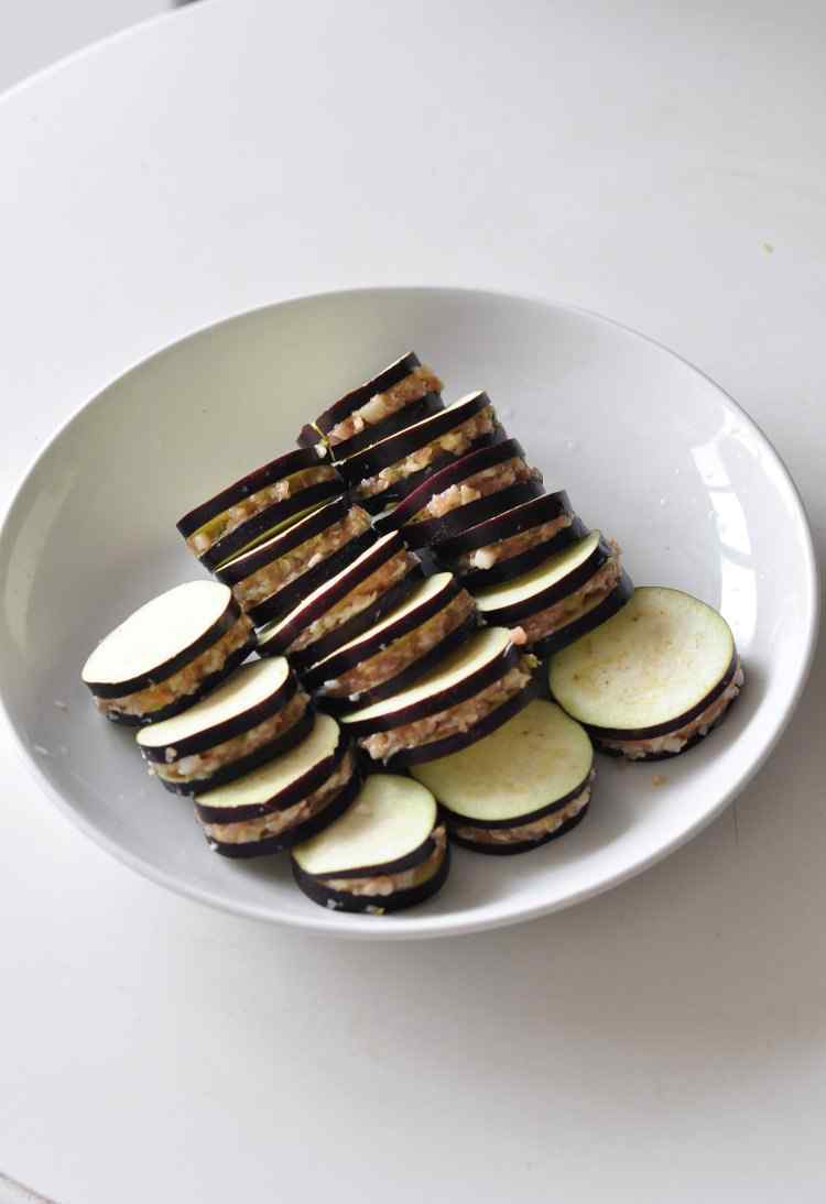 3 茄夹里塞馄饨馅。成一个个的茄盒。
