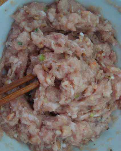 4 虾米浸软后切幼,香菇挤干水份剁成泥,葱姜切碎,放入肉泥碗中。