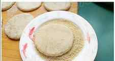 8 擀成厚度约1厘米的圆饼,表面刷一层清水。把饼坯刷水的一面儿倒扣在芝麻仁上,稍压。拿起饼坯抖掉粘不结实的芝麻仁。