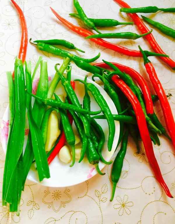 2 准备好青、红辣椒,大蒜、青蒜、姜、洗净备用。