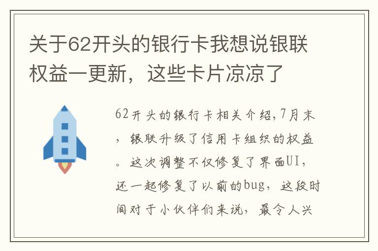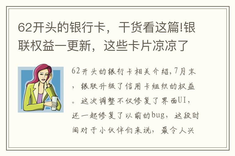 2.《【62开头的银行卡】银联权益一更新,这些卡片凉凉了》仅供读者参考,本网站未对该内容进行证实,对其原创性、真实性、完整性、及时性不作任何保证。