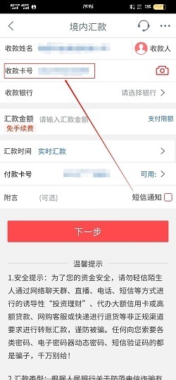 在转账汇款页面,即可查看对方完整的收款卡号。