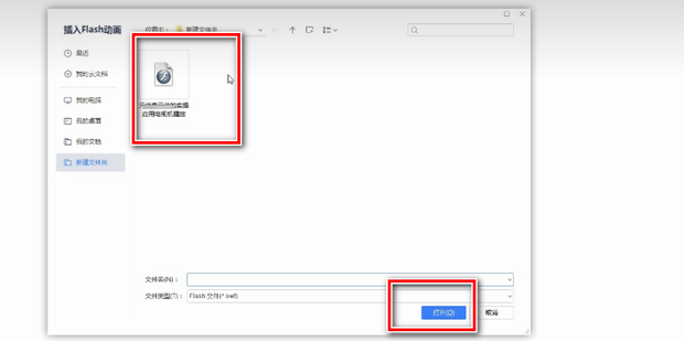 - 找到“插入flash动画”弹框,选择flash文件,点击打开按钮。