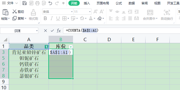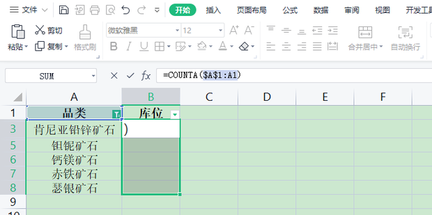 - 输入函数公式:=COUNTA($A$1:A1)。