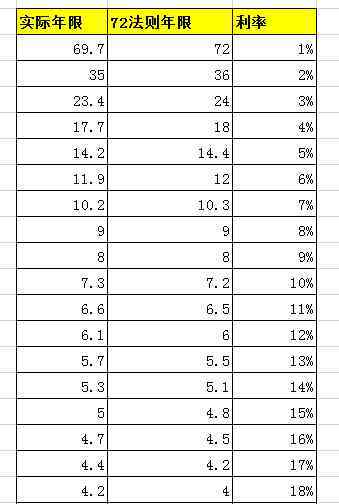 假设年收益是10%,那么72÷10=7.2年,也就是大概7.2年可以将投资的资金翻倍,如果我们用标准的复利计算公式的结果是7.27年。