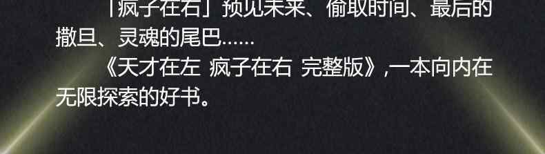 《天才在左 疯子在右》品书君实际上以前看了了,那时候可能也没咋看搞清楚。如今拾起起來,也是有很多获得。该书是中国第一本具备人文精神的访谈录方式的文学著作。內容涉及到生理、社会心理学、佛法、宗教信仰、量子物理、符号学及其玛雅文化和推测等诸多行业。这也是一直居热销排名榜的缘故之一吧!