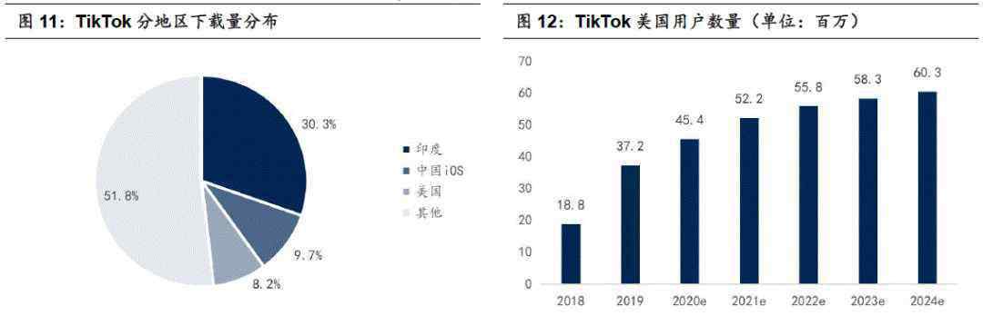 一直以来,国内应用出海的优势区域在于新兴市场国家、优势品类在工具类产品,TikTok正逐步改变这一状态。从全球TikTok下载量上看,印度是最大市场,累计贡献6.11亿次下载,占全球总下载量的30.3%;中国iOS市场贡献1.96亿次下载,占比9.7%;美国市场贡献1.65亿次下载量,占比8.2%位列第三。美国市场的单用户价值非常高,以2019年计,美国3.3亿人口共2440亿美元广告收入,中国14亿人口共1200亿美元广告收入,美国移动互联网用户的广告价值是中国移动互联网用户的数倍,并且美国流行内容在欧洲也有较大接受程度。根据eMarketer统计,2019年TikTok美国用户数达3720万,仅次于Facebook、Youtube、Instagram等老牌TOP应用。据我们所了解,TikTok美国用户数或大于eMarketer统计水平,并且20年仍保持着快速增长态势,如果增长顺利,21年有望是TikTok美国地区商业化的重要一年。