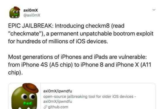 据悉,这款iPhone越狱工具名为Checkm8,读作checkmate,在象棋术语中是“将死”的意思。它支持从iPhone 4s到iPhone X的所有机型,以及iPad、iPod touch等其他iOS设备使用相同的A系列处理器,提供终身越狱体验,无法修复。俗话说“路的高度是一尺,魔的高度是一尺”,Checkm8的作者axi0mx简直把iPhone这几年在系统安全方面所做的努力变成了白费力气。