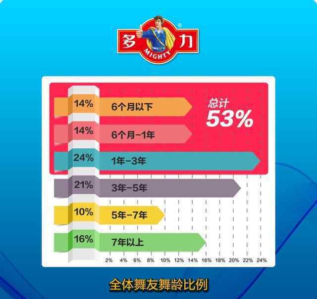 这三年可谓广场舞的井喷时代。调查中,53%的舞者在最近三年开始跳广场舞;同时,去年对于男舞者来说是一个爆发期,40%的男舞者只是在去年才开始跳广场舞。