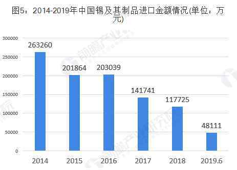 截至2019年上半年,锡矿进口额4.81亿元,同比下降14.6%;锡矿进口锡含量约2.39万吨,同比下降20%;其中,从缅甸进口约2.14万吨,同比下降28%。