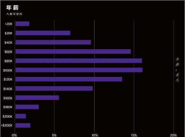 奥莱利调查中所有受访者的平均工资为9万美元。从下图可以看出,几乎一半的软件从业者年收入在6万到14万美元之间。有没有高薪行业?别拦着我,我要当码农!