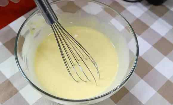 4.将牛奶和鲜奶油混合,慢慢倒入面盆,搅拌均匀成富努多面糊