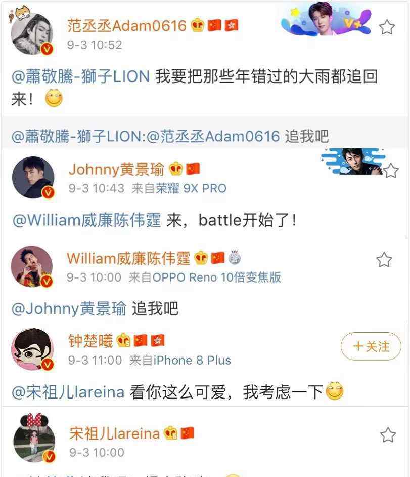 随着一群嘉宾的接力,《追我》的阵容逐渐浮出水面:陈伟霆、亚当、约翰尼、萧敬腾、拉莱娜、钟欣桐,主持人是华少。