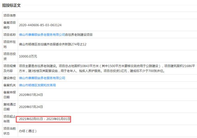 目前该地块未找到更多详细信息,但从招投标的文件来看,项目名为“康善颐安养老服务有限公司”,建设的起止日期为2021.2-2023.1月。