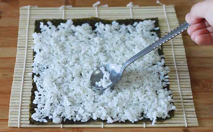 5 卷帘上铺一片海苔,然后铺上米饭用勺子均匀的压平,前端1cm不要铺米饭,否则很难收口。