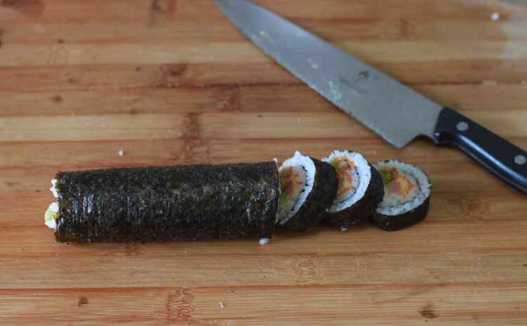 9 去掉卷帘,切成1.5cm左右宽,每次切刀都要用清水洗净,这样切口才整齐漂亮。