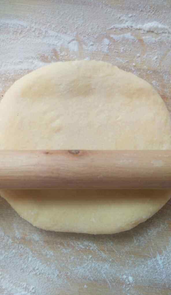 6 先把之前揉好的鸡蛋面团放在面板擀成薄厚适中的面皮