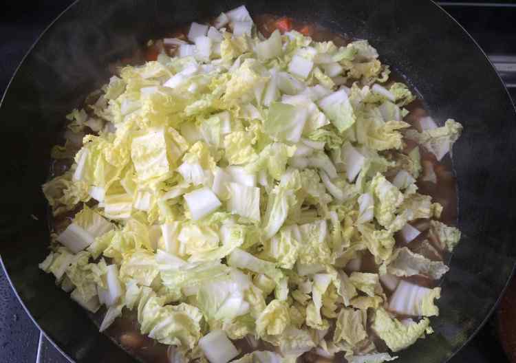 23 锅内的食材煮的差不多熟了,放入白菜继续煮一会儿