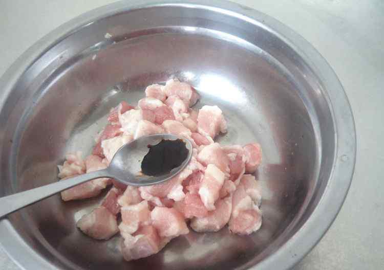 7 锅烧热,加少许油,腌制好的肉丁入锅炒,炒至变色盛出备用