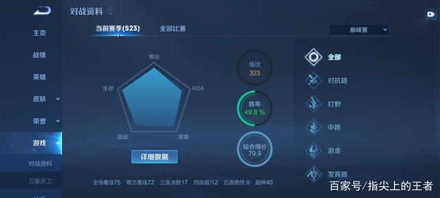 水平比剑仙高了不少,用323场就打到了这个分段,但是胜率只有不到50%,怎么来的呢?还不是靠着巅峰能量啊。